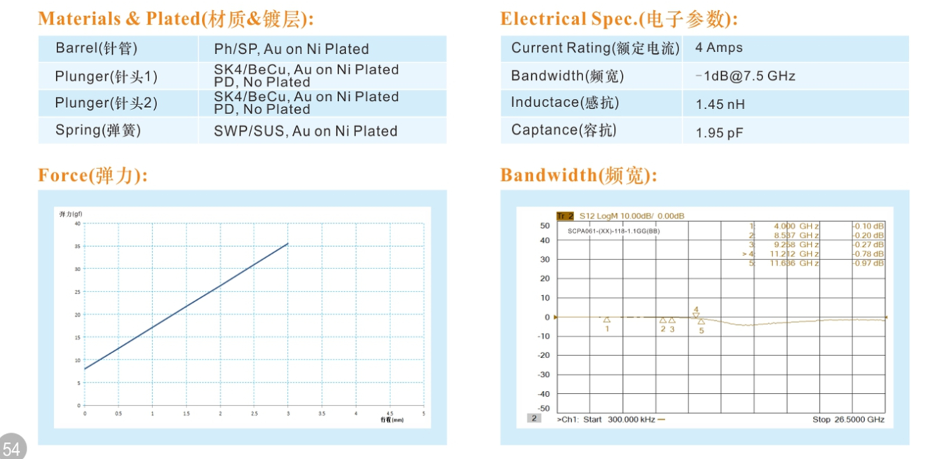 Mainly used for extremely low contact resistance and ultra-high bandwidth in various communikcation power electronic components, semiconductorwafer testing, chip packaging testing, etc, meeting the requirements for high-frequency signal testing at 5-40G.